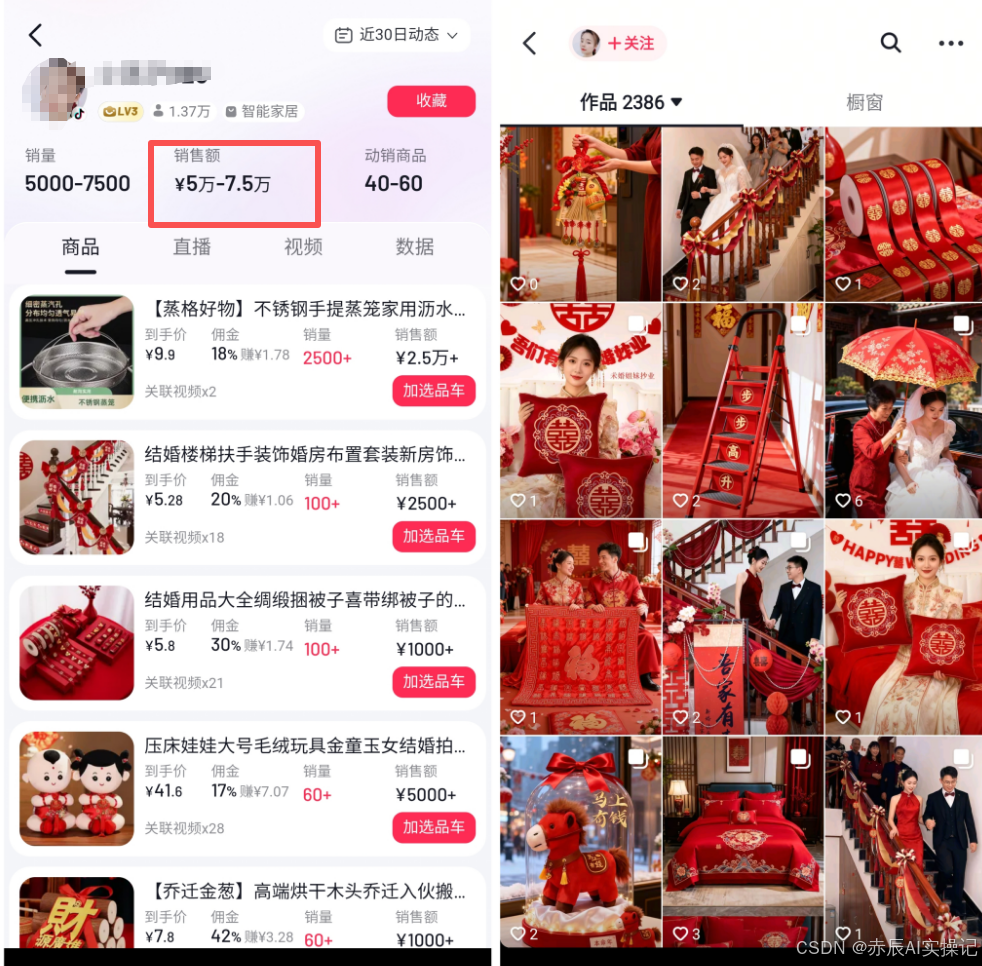 下面这个账号,近30天销售额5万-7.5万,而且完全是靠AI批量生成图文带货婚庆用品!比如喜糖、糖盒、拉花、彩带、气球、拱门支架、新房布置装饰、喜字贴、纸窗花、婚庆家纺等一系列商品。