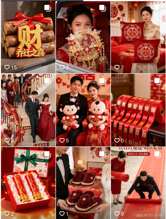 这跟传统的带货账号完全不一样,之前做婚庆用品的账号还得请模特拍照、做视频、剪辑,但这个账号直接用AI生成图文,不仅节省了很多人力成本,还能保证内容的一致性。