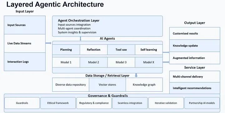 此外,架构通过输入层与输出层实现与真实业务环境的持续交互,使Agent能够感知实时数据流并将执行结果回写至业务系统,形成闭环运行。最底层的服务与治理层则将合规、安全、成本控制与伦理约束作为一级架构要素,通过Guardrails、策略验证与迭代评估机制,确保Agentic AI在可控边界内运行,具备生产级部署与运营能力。