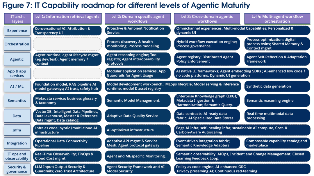 从Lvl1信息检索型智能体的基础信息交互,逐步升级到Lvl2领域特定智能体工作流”的单一业务域自动化,再到Lvl3跨领域智能体工作流的跨域协同,最终达成Lvl4多智能体工作流编排的自主流程优化与动态适配。
