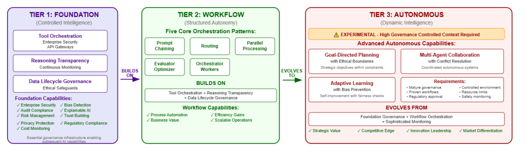 AKKA推出的三层递进式Agentic AI架构,核心原则是治理、透明与安全优先于自主能力:先通过基础层的工具编排、推理透明、数据生命周期治理建立信任与合规基础;再通过工作流层的5个核心编排模式实现结构化自主与业务自动化;最后在自主层落地目标导向规划、自适应学习、多智能体协作等动态智能能力,需基于前两层的成熟治理框架。