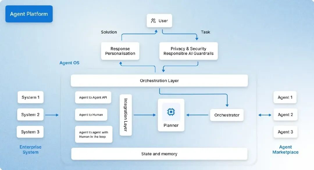 中间的Agent OS是控制核心,其编排层通过规划器拆解用户任务、编排器调度智能体市场(右侧资源池)中的职能智能体,集成层支持智能体间、智能体与人、带人机协同的三类交互模式,状态与记忆层存储上下文信息保障推理连贯性,安全与个性化层则通过合规护栏管控风险、生成适配方案;顶部的User层是任务的发起与接收端。