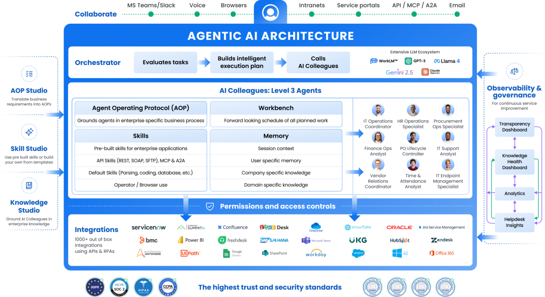 Leena AI的企业级Agentic AI全栈架构,是一套以AI同事(AI Colleagues)为核心执行单元的端到端智能自动化方案,通过分层设计实现了易用性、自主性与企业级合规性的统一,精准适配了企业复杂业务场景的落地需求。