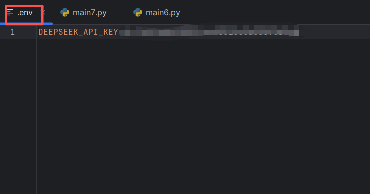 1. 环境配置与模型初始化:首先配置项目环境并初始化大语言模型,本次同样使用deepseek模型,需要提前执行pip install langchain-deepseek安装相关的依赖包,并在项目文件夹下新建.env文件,将注册的DeepSeek API填入该文件中。