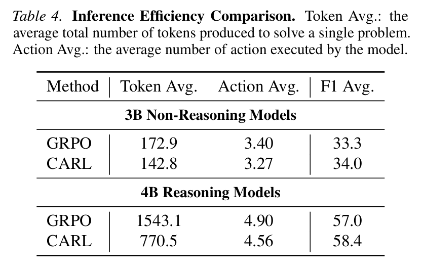 效率的提升同样令人印象深刻。CARL以更少的训练样本和在推理时生成更少的令牌,实现了更高的性能。例如,对于推理模型,CARL在使用相似探索预算和不到40%训练样本的情况下,其最终准确率平均超过GRPO 1.4个百分点。 此外,表4显示,经过CARL训练的智能体更加直接和经济,以显著更少的行动解决问题,在某些情况下,使用的推理令牌数量减半。