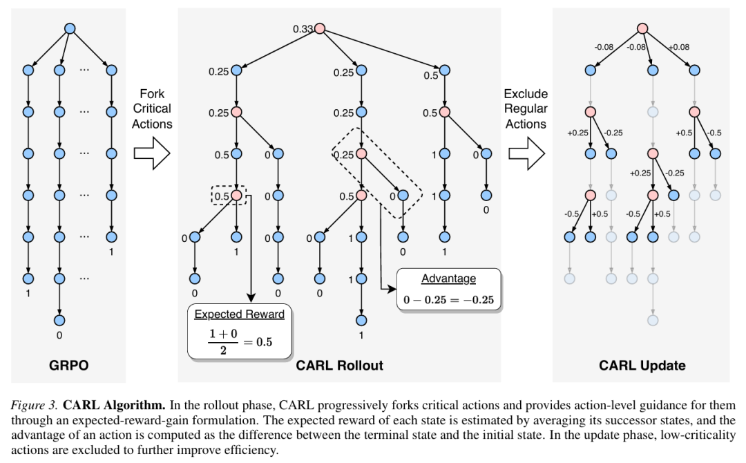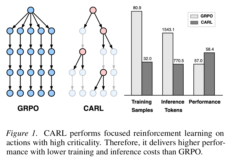 - 定向探索:CARL识别关键决策点,并从这些状态“分叉”进行探索,生成替代行动序列,以理解在这些关键节点做出不同选择的后果。