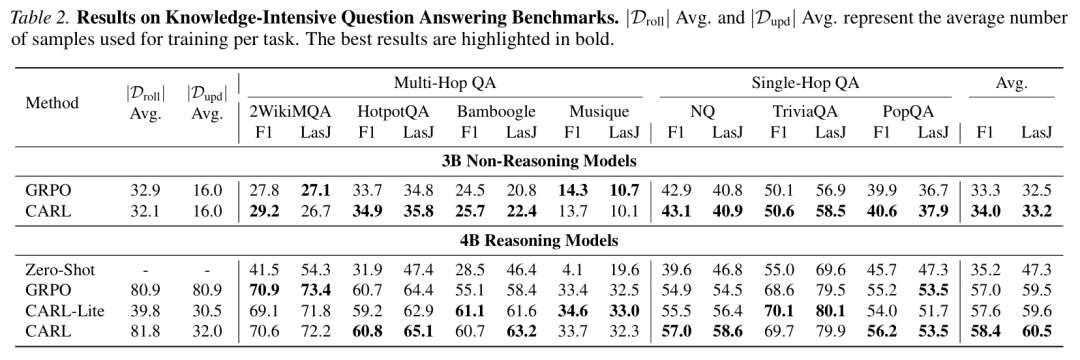 实证结果令人信服。如表2中的主要结果所示,与GRPO相比,CARL在所有模型主干和知识密集型问答基准测试中 consistently 提供了更好的性能。 对于能力更强的推理模型,其优势尤为明显。