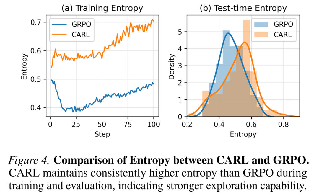 CARL 聚焦于关键之处 的设计理念是一个范式转变。其选择性更新机制不仅加速了训练,还带来了一个关键的额外好处:它保持了模型的多样性。如图4中的熵分析所示,CARL在整个训练过程中保持了更高的策略熵,这表明其具有更强的探索能力和降低陷入单一、过度确定性策略的风险。这使得智能体更加稳健和适应性强。