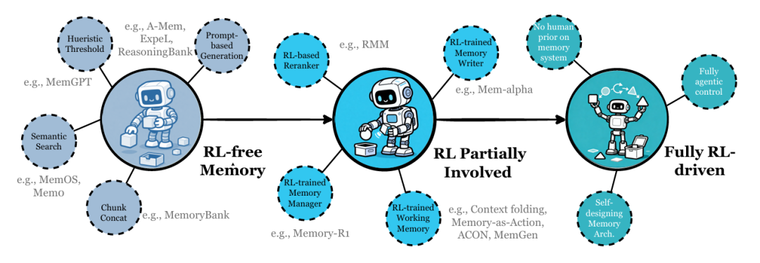 早期的记忆系统依赖于手工制作的启发式规则进行管理。未来在于自动化记忆管理,即代理学习控制自己的记忆。这包括能够随时间适应其拓扑结构的自组织记忆结构,以及使用强化学习(RL)来优化记忆生命周期的每个方面,从形成到遗忘。如图11所示,该领域正从无RL系统向完全RL驱动的架构发展,其中记忆是代理策略中一个可学习的、共同演化的组成部分。