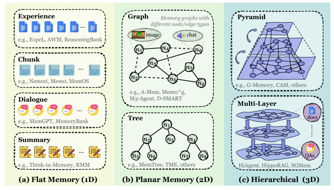 - 扁平记忆(1D): 信息以简单的列表或单元"包"形式存储,如对话日志或经验轨迹。它简单且可扩展,但缺乏关系结构。