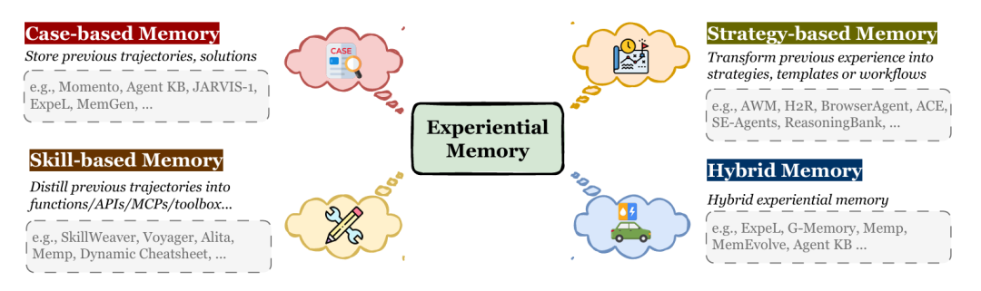 - 基于技能的记忆将策略操作化为可执行的程序,如代码片段或API调用。这构成了代理关于其"能做什么"的活跃工具箱。