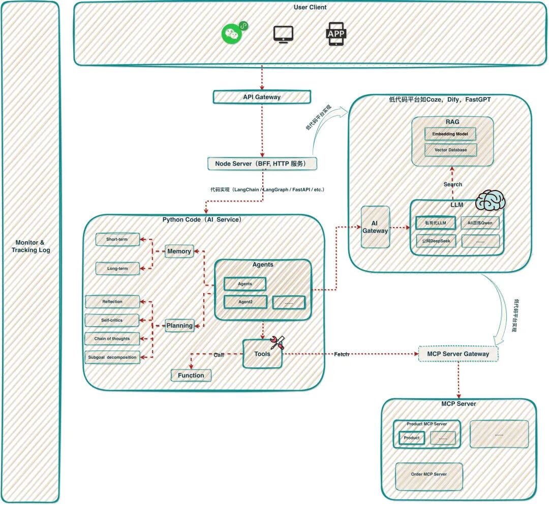 代码实现:建议Python代码,因为AI生态较完整,Python的LangChian、LangGraph框架,LangSmith(Event-Tracking,类似埋点最终,企业版本license收费,可以用开源的替代品如Langfuse等代替)为主;代码实现也有以Google为代表的Google ADK(Agent Development Kit),考虑到现状Google生态在国内的尴尬,ADK并不足与发挥他的最大威力,如一键部署Google Cloud Run,调用Google的Gemini等。