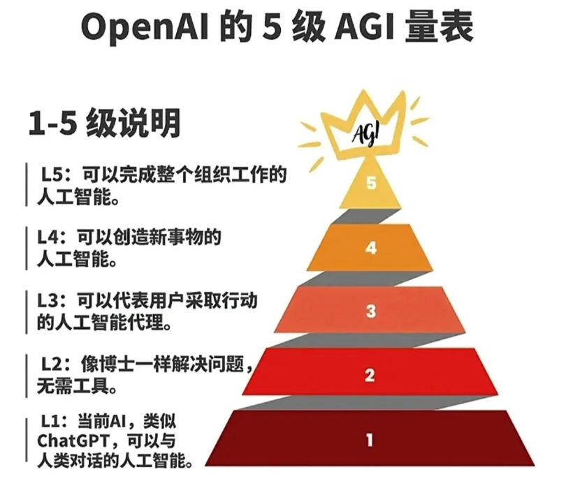 | 第5级 | 组织者 (Organizers) 能替代一个人类组织(如公司) 的绝大部分职能,自主完成目标管理、协作和执行。 | 属于科幻范畴。 这远超出当前技术框架,涉及通用人工智能的终极形态。 |