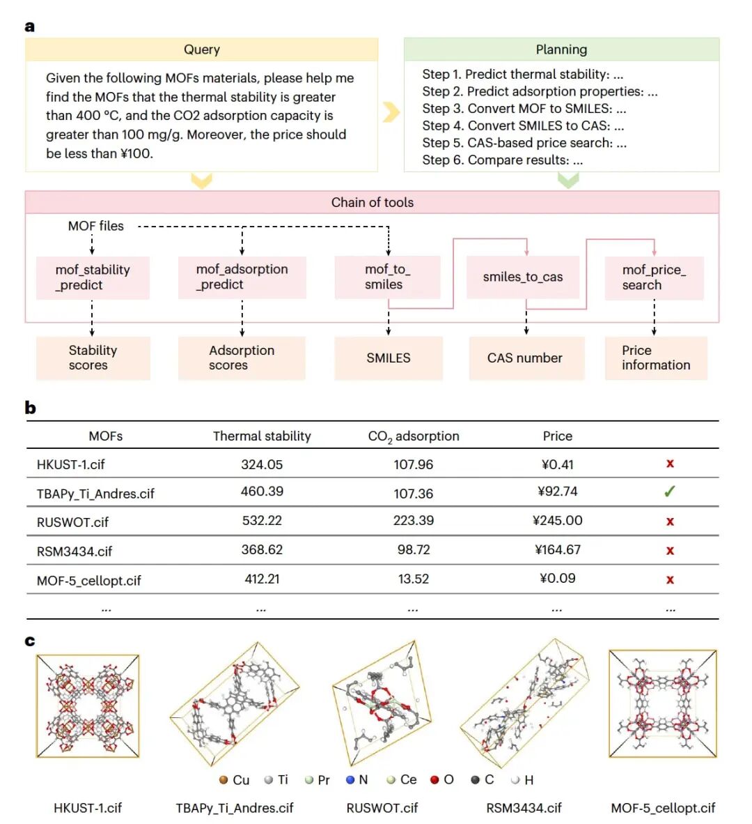 图6|基于SciToolAgent的MOF材料筛选流程及结果。 a,输入查询、工具规划、工具链以及对应输出结果的整体概览。b,筛选结果汇总,展示了各MOF材料的热稳定性、CO₂吸附容量以及市场价格,其中绿色对勾表示同时满足所有设定条件的MOF材料。c,所筛选MOF材料结构的可视化结果。