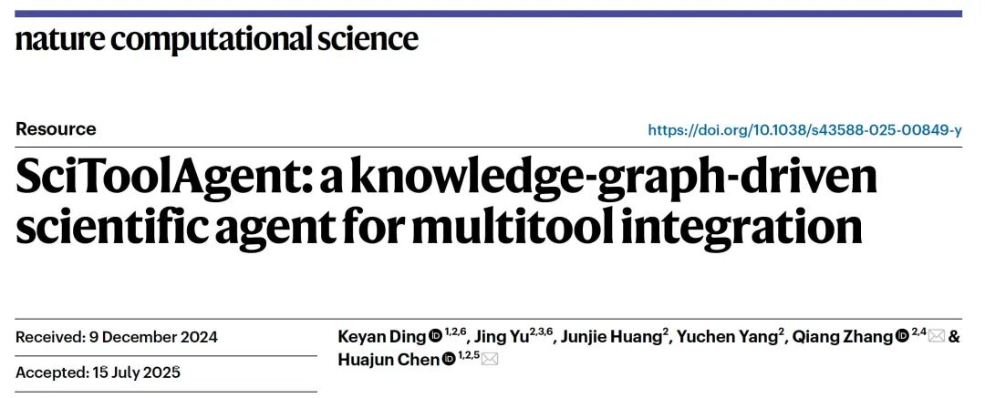 今天介绍的这项工作来自 Nature Computational Science。该文介绍了一种面向科学研究的新型智能体系统SciToolAgent,其核心目标是在生物、化学与材料科学等领域,实现大规模科研工具的自动化集成与协同使用。随着科研工具数量和复杂度的持续增长,单纯依赖人工或简单的大语言模型提示已难以高效完成多步骤、跨工具的科学任务。SciToolAgent通过引入科学工具知识图谱,显式刻画工具之间的功能关系、输入输出依赖与安全属性,从而为复杂科研问题提供结构化、可解释的工具规划能力。该文章系统阐述了SciToolAgent的整体架构与关键技术,包括基于知识图谱的工具链规划、多工具顺序执行机制以及贯穿全流程的安全审查模块。在覆盖531个问题的综合评测基准上,该系统在工具规划准确率和最终答案准确率方面均显著优于现有方法。多个真实科研案例进一步展示了其在蛋白质设计、化学反应性预测、化学合成分析以及金属有机框架材料筛选等复杂场景中的实用价值。总体而言,该文不仅提出了一种可扩展的多工具科学智能体框架,也为大语言模型在严肃科学研究中的安全、可靠应用提供了新的思路,对推动科研流程自动化与降低专业工具使用门槛具有重要参考意义。