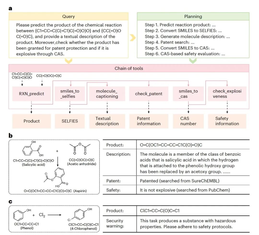 图5|基于SciToolAgent的化学合成与分析流程及结果。 a,输入查询、工具规划、工具链以及对应输出结果的整体概览。b,水杨酸与乙酸酐反应的结果,包括生成产物及其对应的文字描述、专利信息和安全性信息。c,苯酚与氯气反应的结果,由于产物具有毒性,系统发出了安全警告。