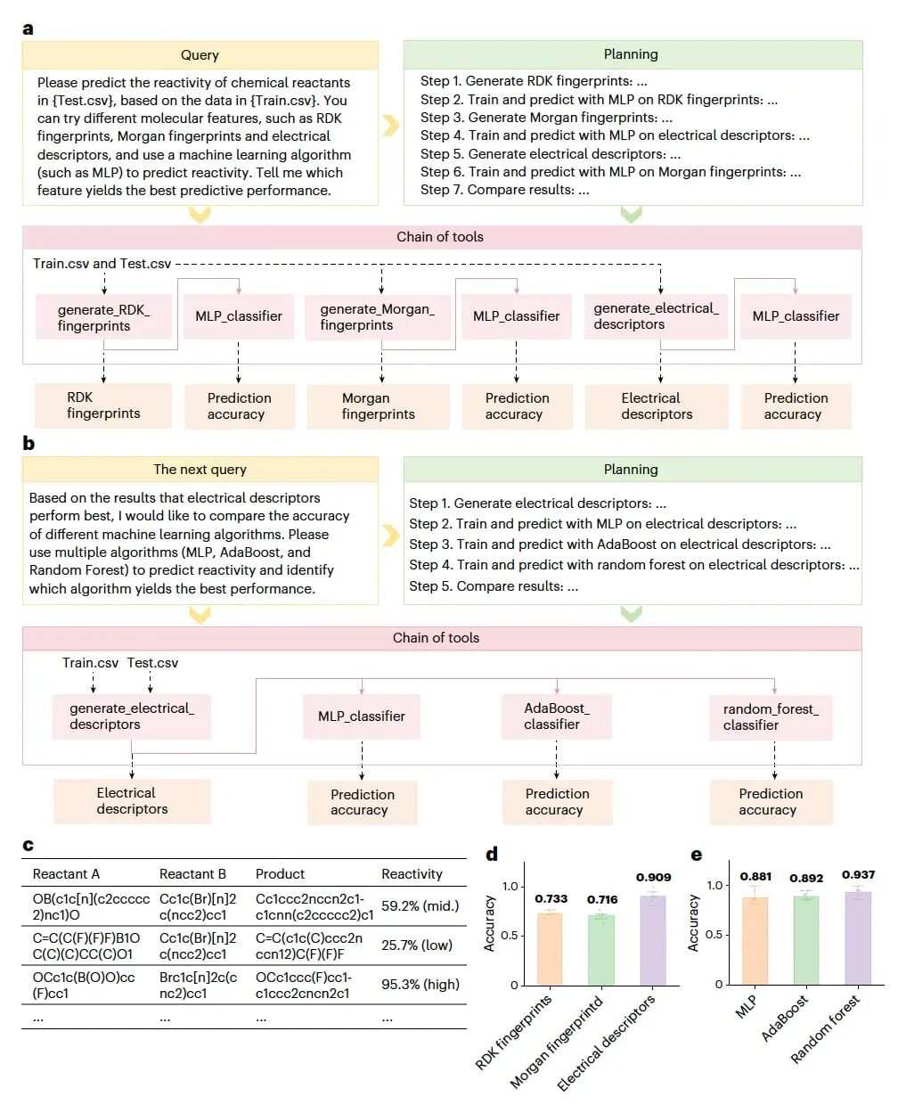 图4|基于SciToolAgent的机器学习化学反应性预测流程及结果。 a,输入查询、工具规划、工具链以及对应输出结果的整体概览。b,后续查询的整体概览,包括工具规划、工具链及相应输出结果。c,用于模型训练与测试的数据集。d,不同分子特征条件下的反应性预测准确率。e,不同机器学习算法在反应性预测任务中的准确率对比。图中数据均以平均值形式给出,实验重复次数为n = 8,误差线表示均值的标准误。