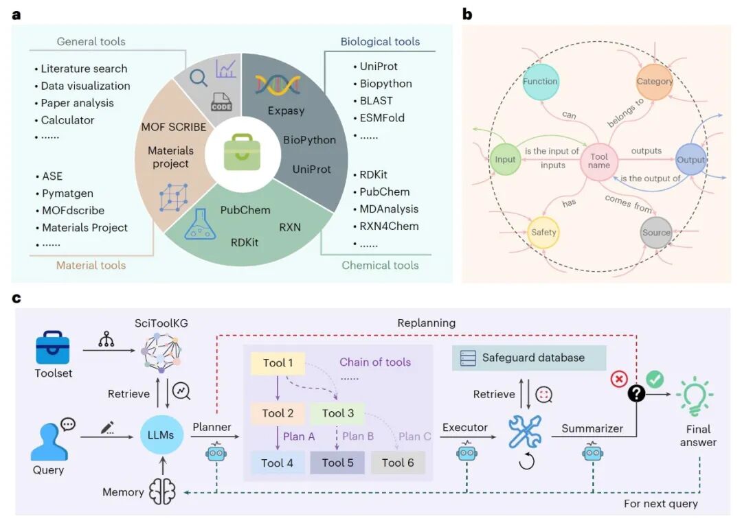 图1|SciToolAgent总体概览。 a,该文所使用的工具集合,其中既包括通用工具,也包括生物、化学和材料科学领域中常用的专业工具。其中ASE指原子模拟环境。b,SciToolKG的结构示意图,该知识图谱包含了每种工具的多维信息,例如输入与输出格式、具体功能、安全等级等内容。c,SciToolAgent的整体工作流程。在接收到用户查询后,基于大语言模型的规划器利用SciToolKG进行检索增强生成,从而构建一条工具链;随后,基于大语言模型的执行器按照既定顺序依次调用并执行这些工具。执行过程中会通过检索安全防护数据库来完成安全检查,以确保结果符合伦理与安全要求。最后,基于大语言模型的总结器对执行结果进行汇总与评估,并在必要时促使规划器生成新的工具链。最终得到的答案将被写入记忆模块,作为下一次查询的上下文信息。