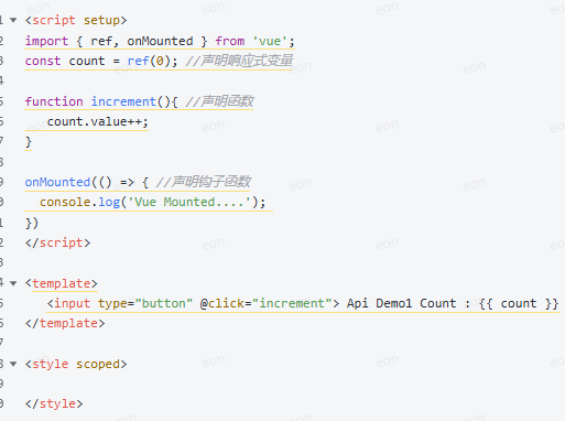 组合式API:是Vue3提供的一种基于函数的组件编写方式,通过使用函数来组织和复用组件的逻辑。它提供了一种更灵活、更可组合的方式来编写组件。代码形式如下:
