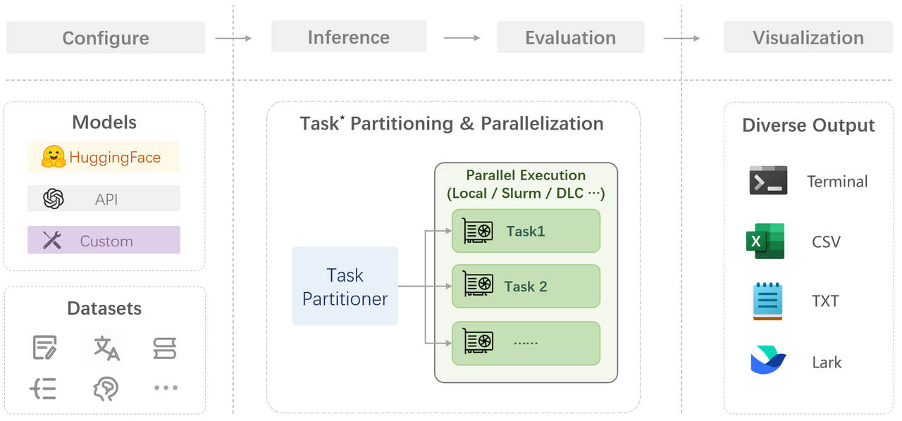 配置:这是整个工作流的起点。您需要配置整个评估过程,选择要评估的模型和数据集。此外,还可以选择评估策略、计算后端等,并定义显示结果的方式。