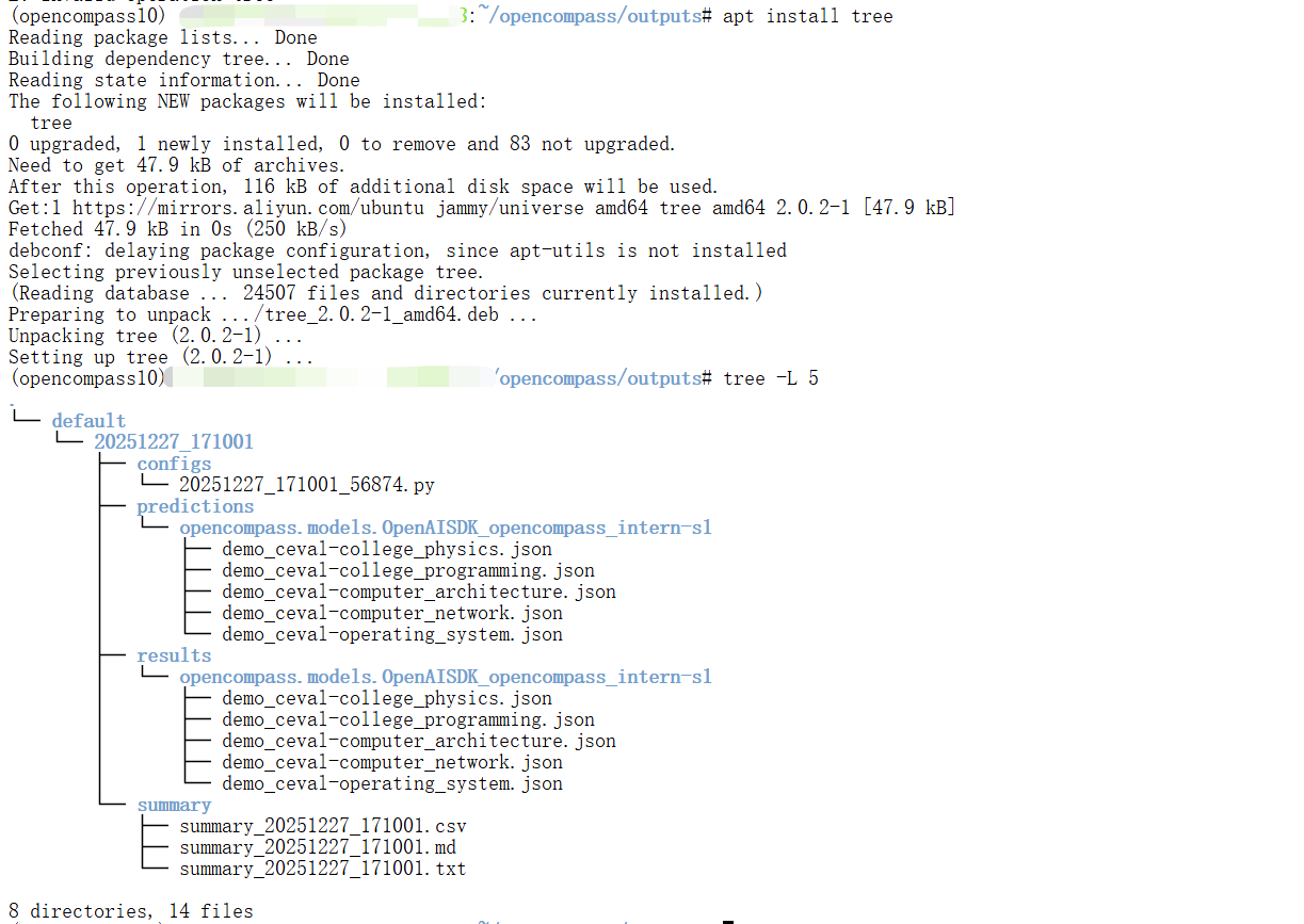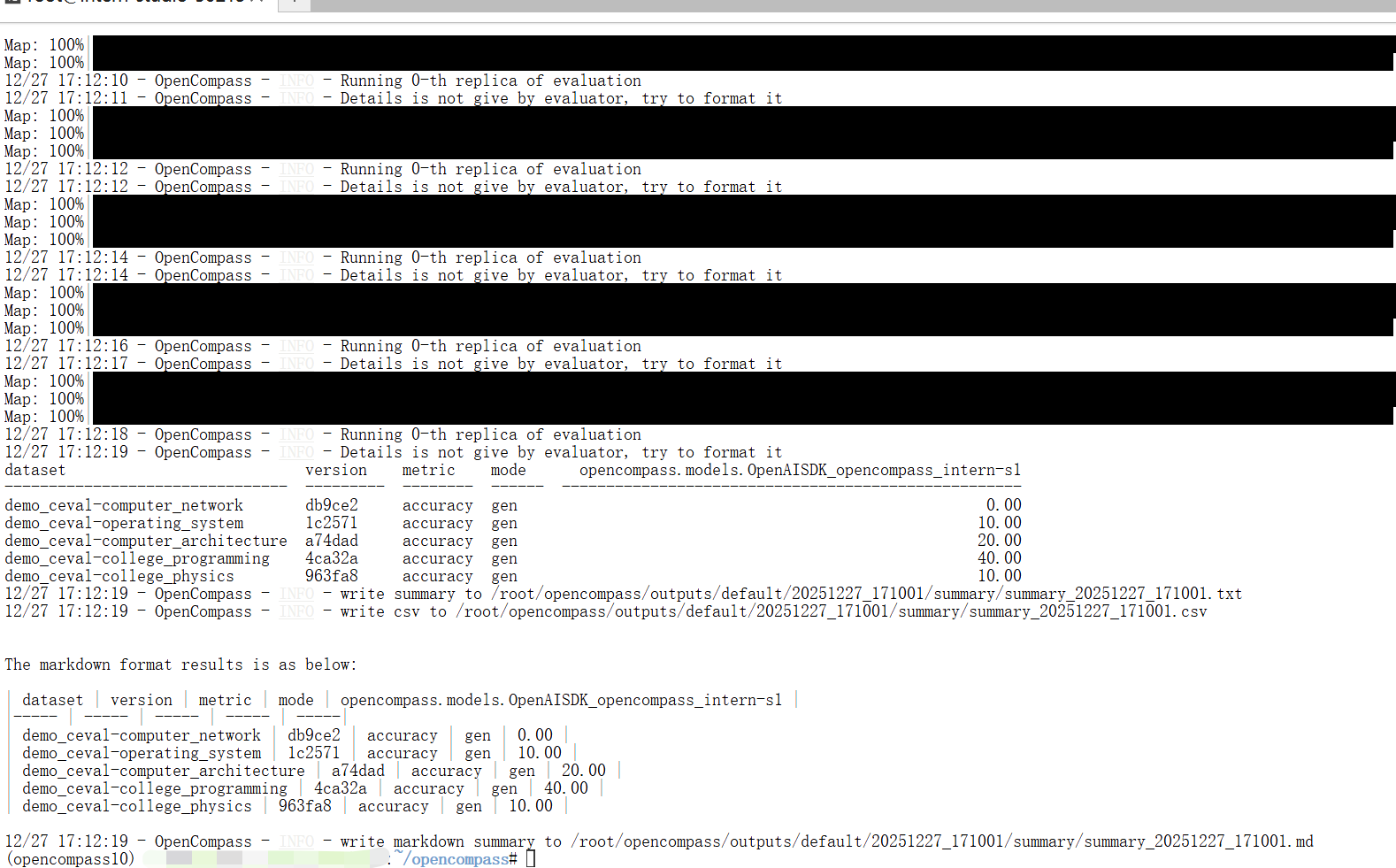 推理与评估:在这个阶段,OpenCompass 将会开始对模型和数据集进行并行推理和评估。推理阶段主要是让模型从数据集产生输出,而评估阶段则是衡量这些输出与标准答案的匹配程度。这两个过程会被拆分为多个同时运行的“任务”以提高效率,但请注意,如果计算资源有限,这种策略可能会使评测变得更慢。如果需要了解该问题及解决方案,可以参考 FAQ: 效率。
