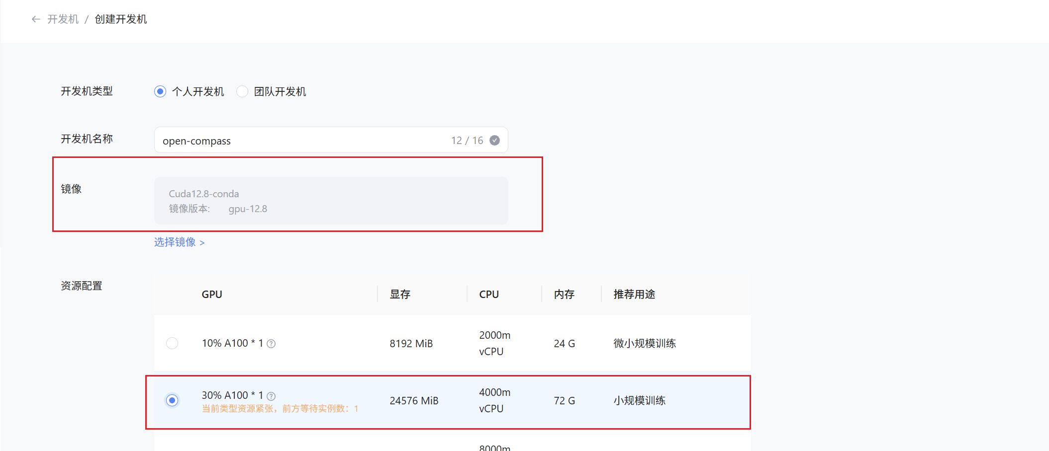 在创建开发机界面选择镜像为 Cuda12.8-conda,并选择 GPU 为 30% A100。