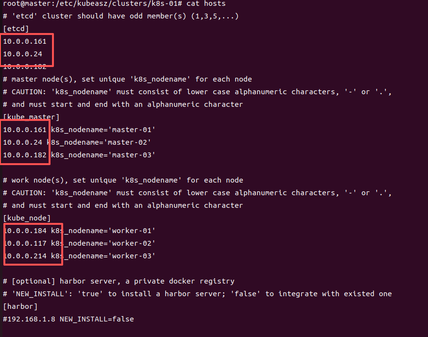 # 容器化运行kubeasz ./ezdown -S # 创建新集群 k8s-01 docker exec -it kubeasz ezctl new k8s-01 2021-01-19 10:48:23 DEBUG generate custom cluster files in /etc/kubeasz/clusters/k8s-01 2021-01-19 10:48:23 DEBUG set version of common plugins 2021-01-19 10:48:23 DEBUG cluster k8s-01: files successfully created. 2021-01-19 10:48:23 INFO next steps 1: to config '/etc/kubeasz/clusters/k8s-01/hosts' 2021-01-19 10:48:23 INFO next steps 2: to config '/etc/kubeasz/clusters/k8s-01/config.yml'