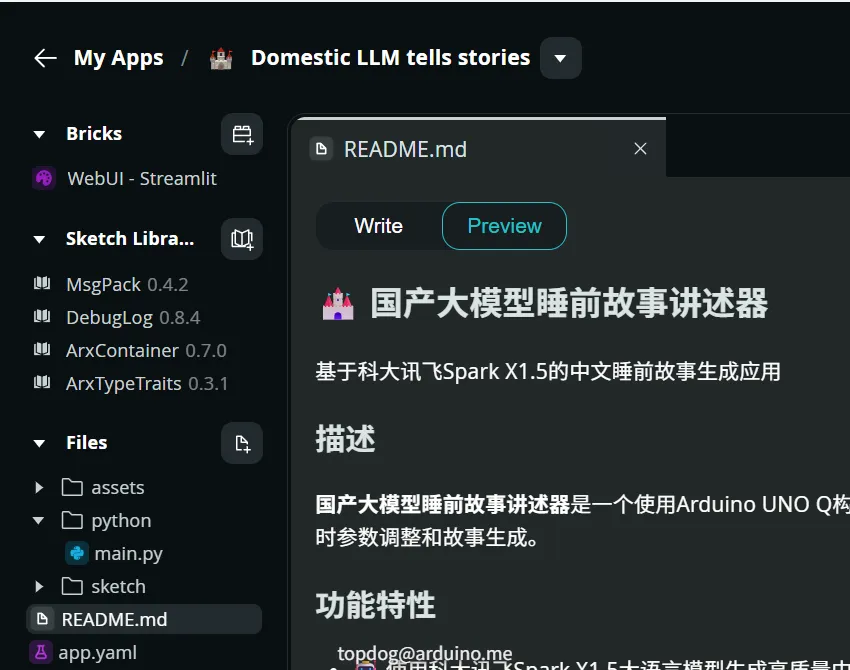 本示例国产大模型睡前故事讲述器是一个使用Arduino UNO Q构建的生成式AI应用,通过HTTP API直接调用科大讯飞Spark X1.5大语言模型,根据用户选择的参数创建个性化中文睡前故事。应用使用Streamlit构建直观的用户界面,支持实时参数调整和故事生成。