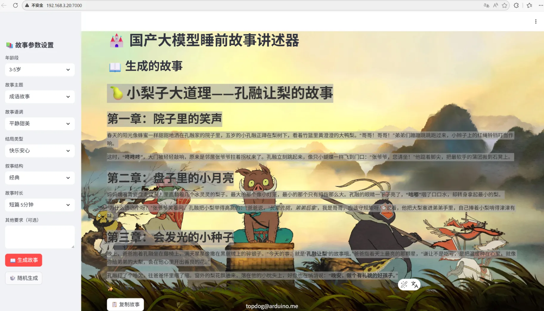 摘要:本文介绍了一款基于ArduinoUNOQ和科大讯飞SparkX1.5大模型的国产AI睡前故事生成器。该系统通过Streamlit构建用户界面,支持自定义年龄、主题、语调等参数,可生成包含成语故事、西游记等中国元素的儿童故事。硬件采用ArduinoUNOQ,软件通过HTTPAPI调用讯飞大模型,无需额外LLMBrick,适合国内网络环境。该方案简化了原厂程序,融入中国元素,展示了国产大模型在教
