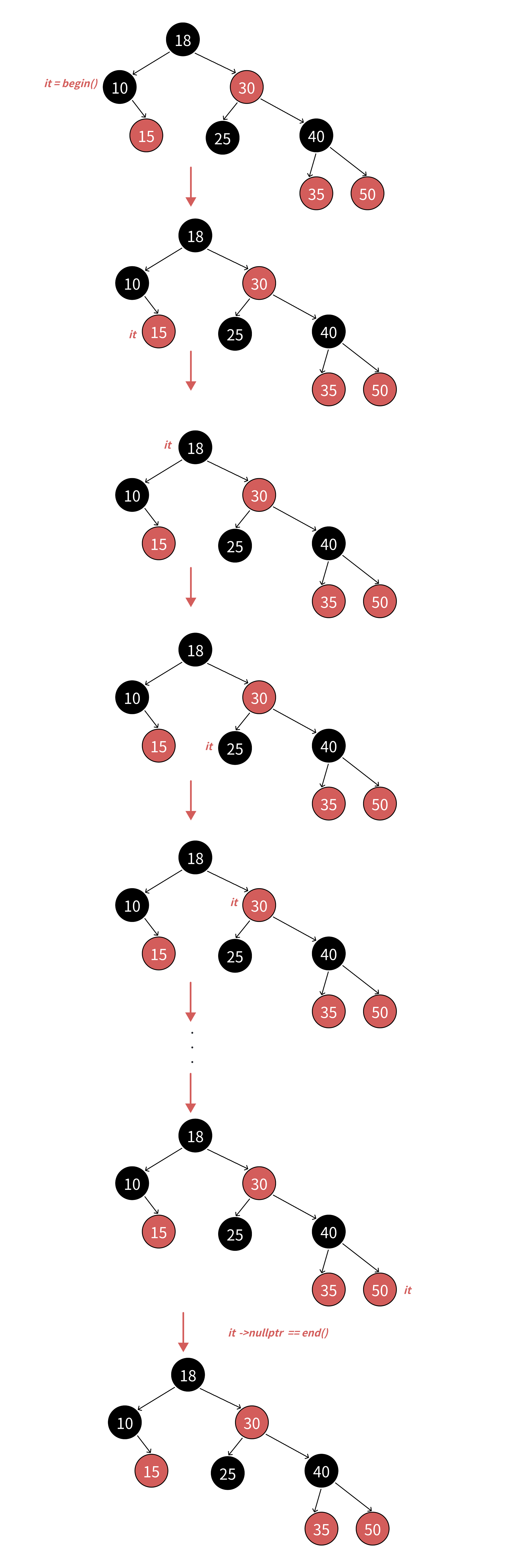 - 如果当前结点时父亲的右,根据中序左子树->根结点->右子树,当前结点所在的子树访问完了,当前结点所在父亲的子树也已经访问完了,那么下一个访问的需要继续往根的祖先中去找,直到找到孩子是父亲左的那个祖先就是中序要走的下一个结点。如下图:it指向15,15为空,15是10的右,15所在子树访问完了,10所在的子树也访问完了,继续往上找,10是18的左,那么下一个访问的结点就是18.