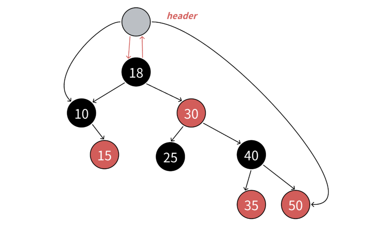 - end()如何表示呢?如下图:当it指向50时,++it时,50是40的右,40是30的右,30是18的右,18到根没有父亲,没有找到孩子是父亲左的那个祖先,这时父亲为空了,那么我们就把it 中的结点指针置为nullptr,我们用去充当end。需要注意的是stl源空,红黑树增加了一个哨兵位头结点做为end(),这哨兵位头结点和根互为父亲,左指向最左结点,右指向最右结点。相比我们用nullptr作为end(),差别不大,他能实现的,我们也能实现。只是–end()判断到结点是空,特殊处理一下,让迭代器结点指向最右结点。具体参考迭代器一个个实现。