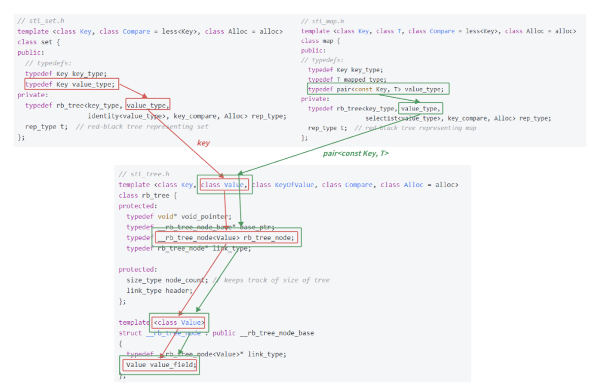 rb_tree时第二个模板参数给的是Key,map实例化rb_tree时第二个模板参数给的时pair<const key,T>,这样一颗红黑树既可以实现key搜索场景,也可以实现key/value搜索场景的map。 - rb_tree 第二个模板参数Value已经控制了红黑树结点中的存储的数据类型,为什么还要传第一个模板参数Key呢?尤其是set,两个模板参数是一样的,这是很多同学这时的一个疑问。要注意的是对于map和set,find/erase时的函数参数都是Key,所以第一个模板参数是传给find/erase等函数做形参的类型的。对于set而言两个参数是一样的,但是对于map而言就完全不一样了,map insert的是 pair对象,但是find和ease的Key对象。