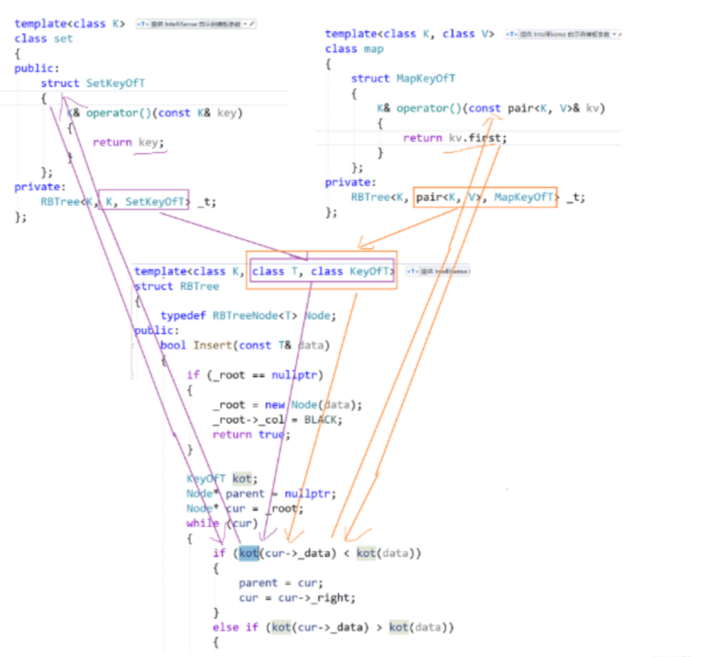 由于 T 的类型不固定(K 或 pair),红黑树插入 / 查找时无法直接获取 key,需通过仿函数KeyOfT统一提取,由 map 和 set 分别实现适配: