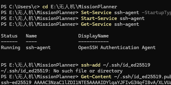# 方法A:设置环境变量 set GIT_SSH_COMMAND=ssh -i %USERPROFILE%\.ssh\id_ed25519 # 然后克隆(使用SSH URL) git clone git@github.com:ArduPilot/MissionPlanner.git MissionPlanner-master