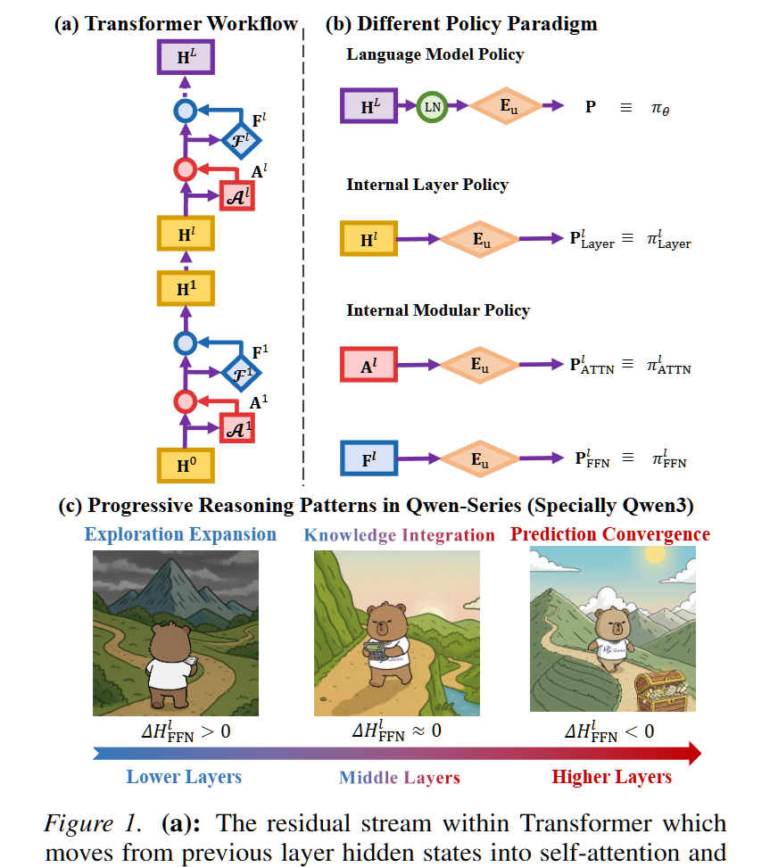 目前的强化学习方法(如 PPO, GRPO)通常把大语言模型(LLM)看作一个单一的黑盒策略。不管模型有多少层,我们只关注最后一层输出的 token 分布。但是,Transformer 结构是层层递进的。这种“一刀切”的视角忽略了模型内部的演化机制。如果能搞清楚策略是如何在每一层中逐渐形成的,就能进行更精细化的优化。这就像教学生解题,不能只看最后答案对不对,更要纠正他中间步骤的思路。