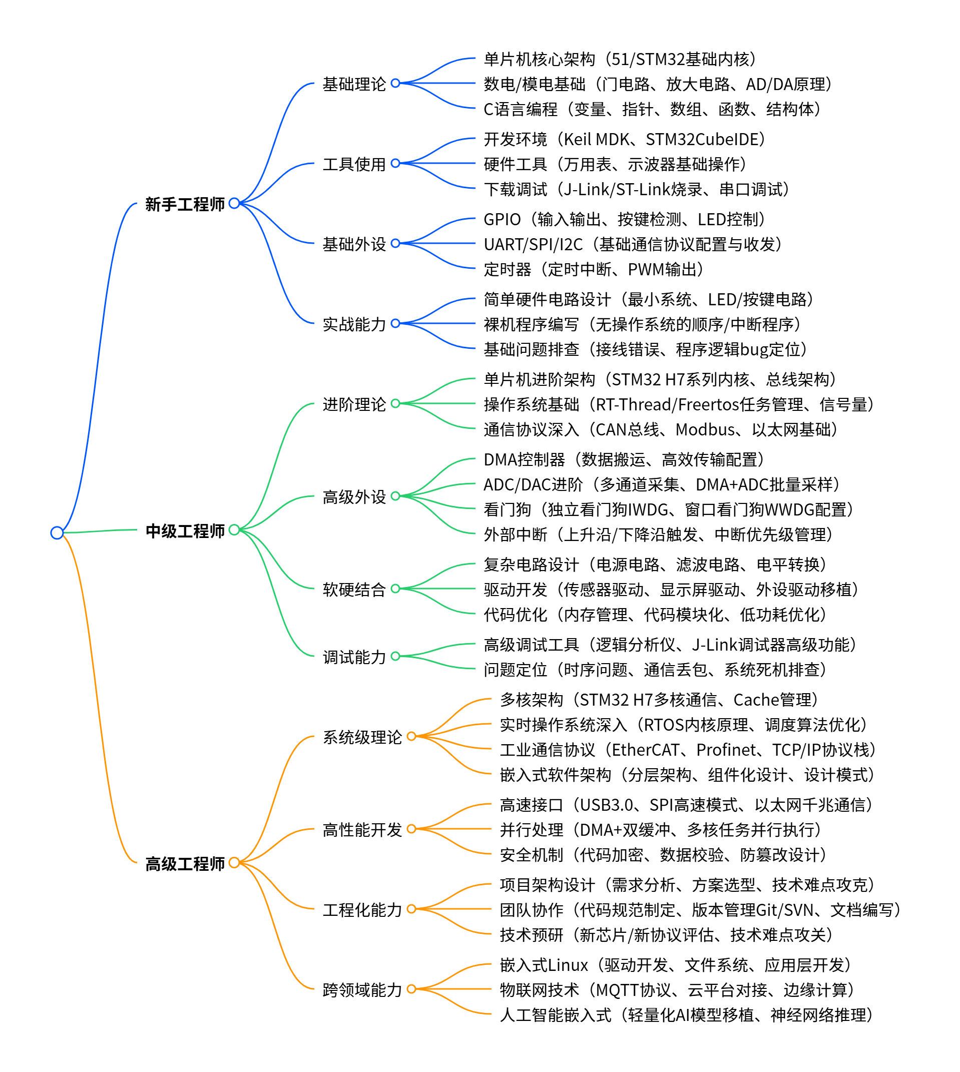 到了这个阶段,已经属于嵌入式单片机领域的资深工程师水平,再往上走需要突破“单一技术栈”的局限,向系统级架构设计和跨领域融合创新的方向延伸,具体可以掌握这些技能: