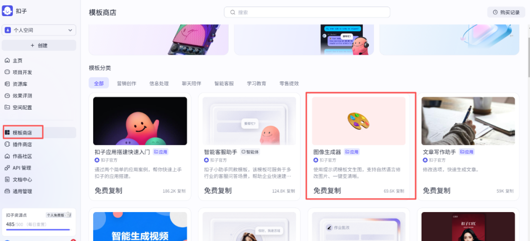 - 在Coze主页(https://www.coze.cn/home)点击模板商店可以看到很多免费可复制的智能体。这里点击扣子官方发布的图像生成器智能体