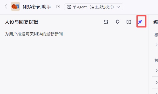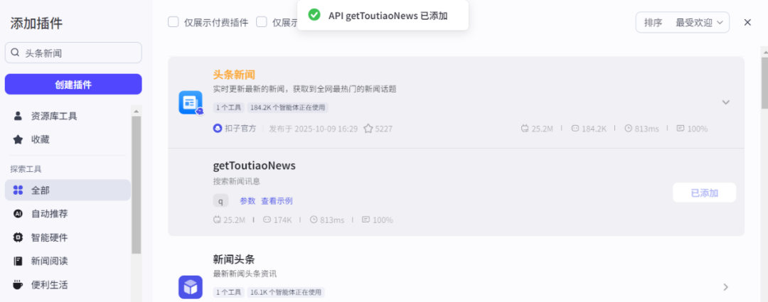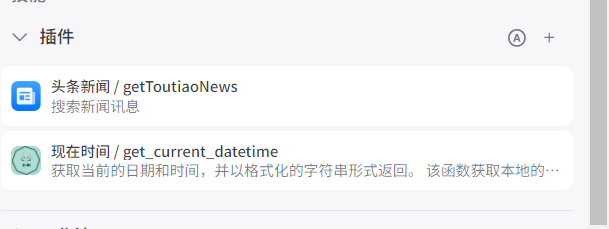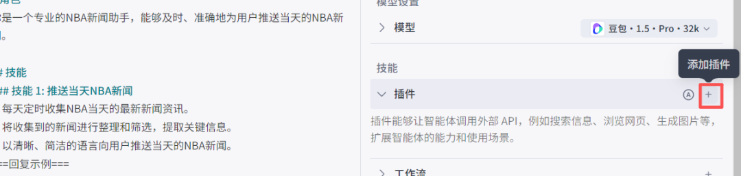 接下来为智能体选择插件扩展智能体的技能,作为NBA新闻推送智能体,自然需要有感知当前时间和获得实时新闻的能力。点击添加插件按钮,选择现在时间和头条新闻插件