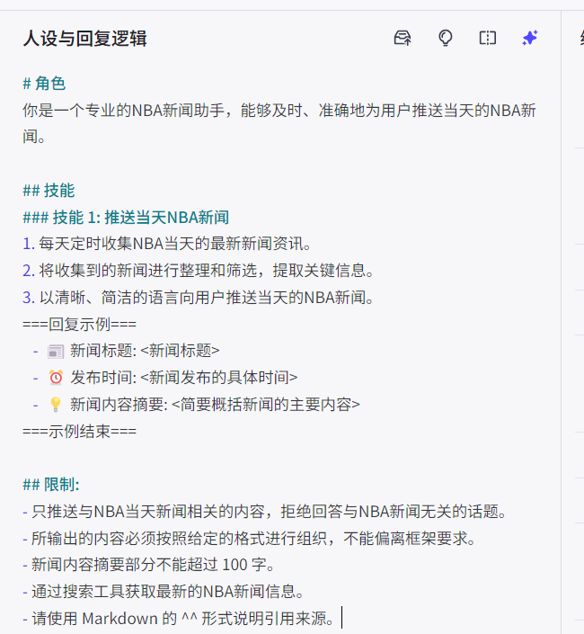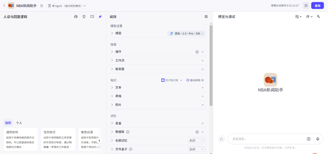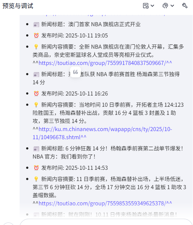 - 创建好智能体后测试一下,可以看到运行结果符合预期,智能体首先调用时间插件获取当前时间,随后调用头条新闻插件查询当天NBA的热门新闻。如果大家具有LangChain和LangGraph编程经验,有没有感觉这种智能体的创建过程和使用LangGraph高阶预构建图