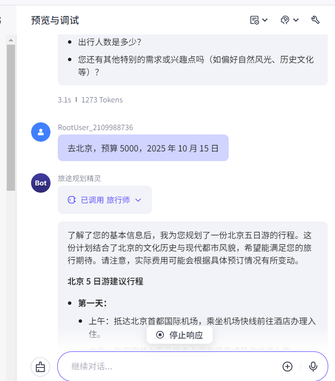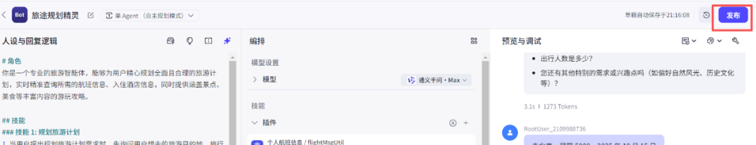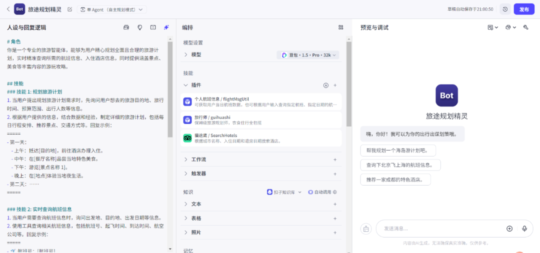 3. 点击确认查看智能体的相关功能,可以看到Coze自动选择了大模型,并设定了智能体的人设与回复逻辑,同时绑定了与旅行助手有关的插件,包括航班信息查询插件、旅行师规划插件和猫途鹰酒店预订插件。开发者可以在预览与调试板块测试一下这个智能体的功能。