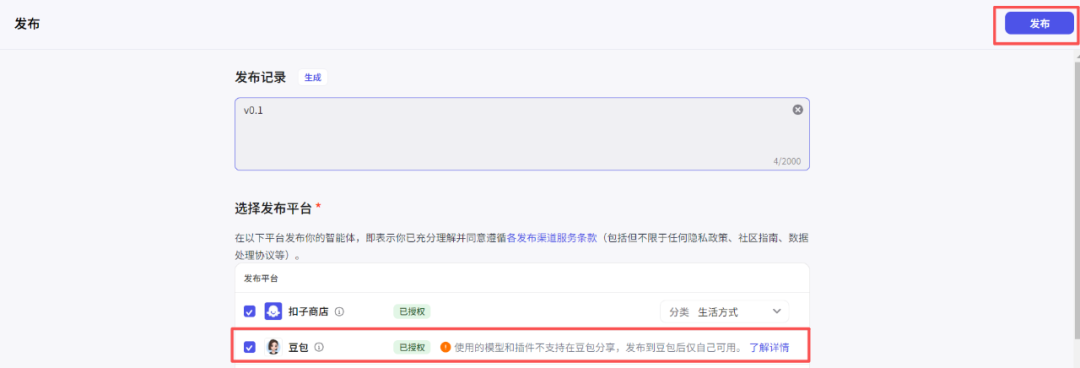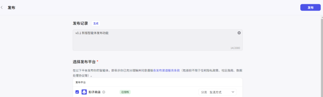 - 智能体功能测试完毕后,点击右上角的发布按钮,在发布页面可以看到Coze支持包括自营商店、豆包和微信小程序等多种发布途径。发布记录中一般编写本次发布的版本号和重要的更新事项,勾选豆包后再次点击发布。