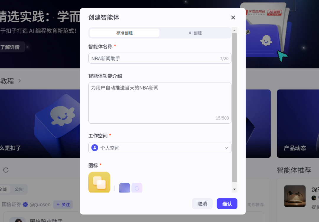 - 选择标准创建, 标准创建要求开发者输入智能体名称,智能体功能介绍,选择工作空间并上传智能体图标。完成后点击确认。