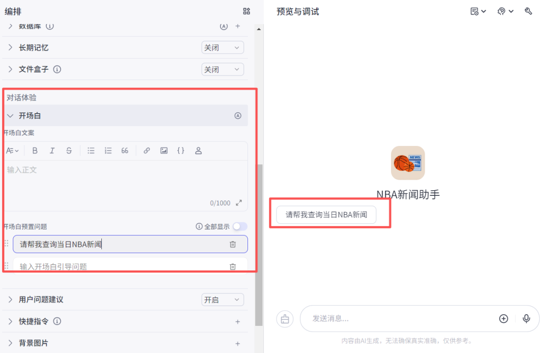为优化体验开发者可以为智能体设置开场白,预设一些问题,在使用时用户只需要点击这些问题就能快速得到结果,不需要逐字输入: