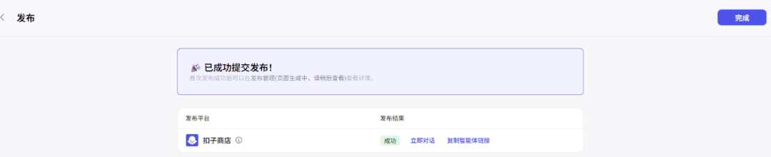 - 测试完成后可以发布智能体,我们这次把智能体发布到扣子平台上,发布完成后可以点击链接使用发布的智能体: