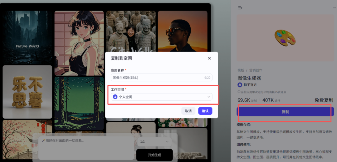 - 在图像生成器智能体页面点击复制,选择工作空间(可以理解为项目所属的文件夹),点击确认, 就可以在个人空间下看到相关项目。