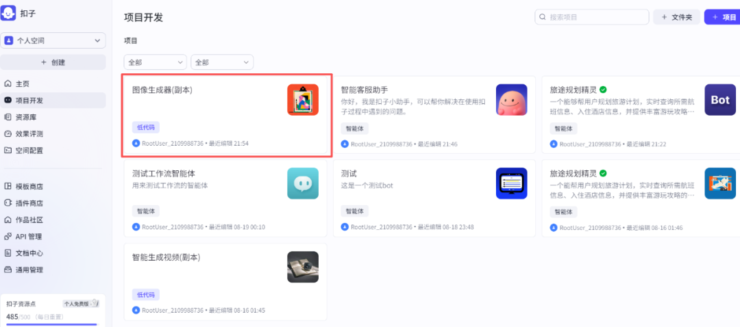 - 点击个人空间下图像生成器(副本)的项目,该项目与其它自建项目一样可以进一步开发,包括修改工作流,添加插件或者发布等,这里就不加赘述了。