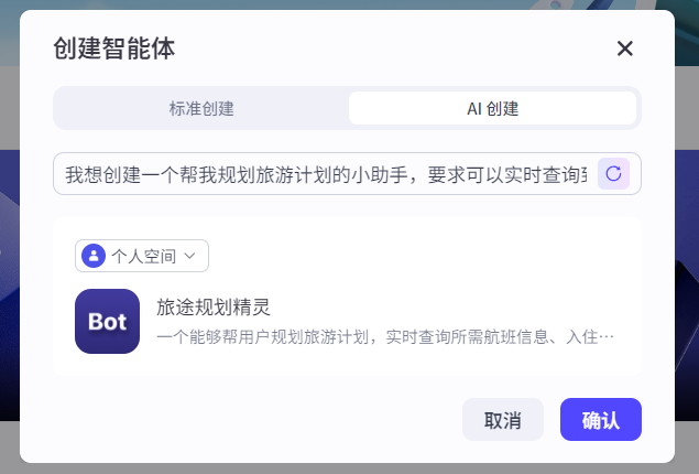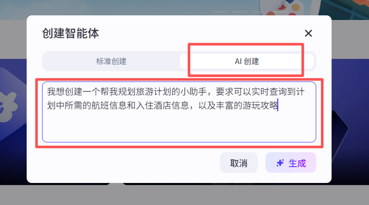 2. 点击创建智能体后会出现两个tab 标准创建和AI创建**,这里选择AI创建。以一个旅游助手智能体为例,输入要生成智能体的功能:“我想创建一个帮我规划旅游计划的小助手,要求可以实时查询到计划中所需的航班信息和入住酒店信息,以及丰富的游玩攻略”,点击生成。Coze就会自动生成一个全新的智能体,是不是非常简单~**
