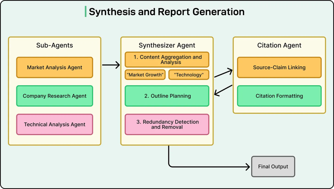 当所有子 Agent 返回结果后,系统就进入综合阶段。此时,系统拥有大量碎片化洞见,它们分别对应研究计划的不同部分。该阶段的目标,是把这些碎片整合为一份统一的报告。