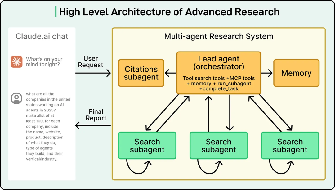 Anthropic 发布过一张其“Advanced Research”模式的高层示意图,用来展示这种多智能体研究系统如何在实际中运转。图中展示了主控代理、不同的子 Agent,以及它们在规划、研究与综合过程中彼此之间的数据流转。