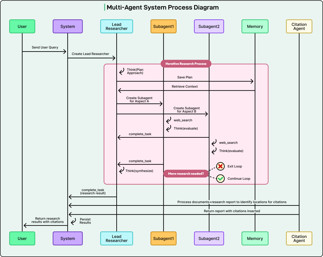 每个子 Agent 会维护自己的短期记忆或“上下文(context)”,用于记录迄今为止看到的内容。这种记忆使它能够形成对其子任务的连贯理解,并避免重复劳动。当子 Agent 完成分配的任务后,它会返回一个结构化的信息包,其中同时包含研究结论与对应引用来源。